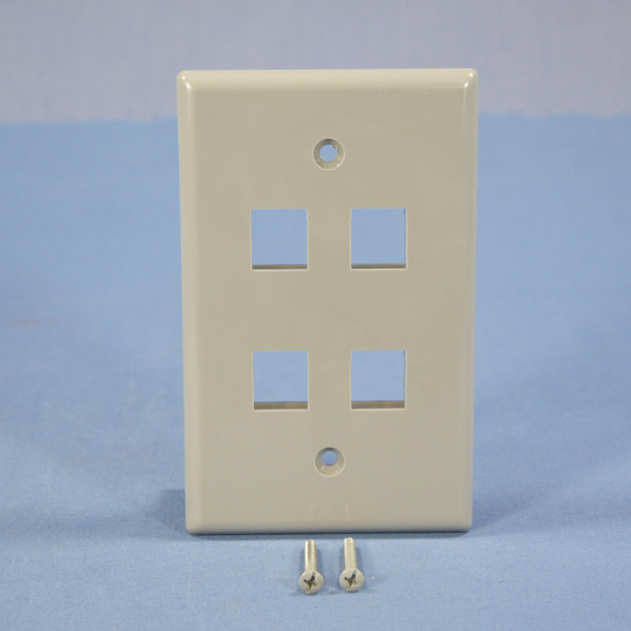 Cooper 5540GY-MSP gray mid-size 110 style 4-port thermoplastic wallplate. Flush mounted design that accepts 110 style snap-in standard jacks, F-connector, audio style, and blank face insert modules for your audio, video, and telecommunications needs. Can be mounted to recessed wall boxes and brackets for a low profile look; also attaches to surface mount wiring boxes. Includes color matching mounting screws. Each is individually packaged; packaging may differ from photo.
