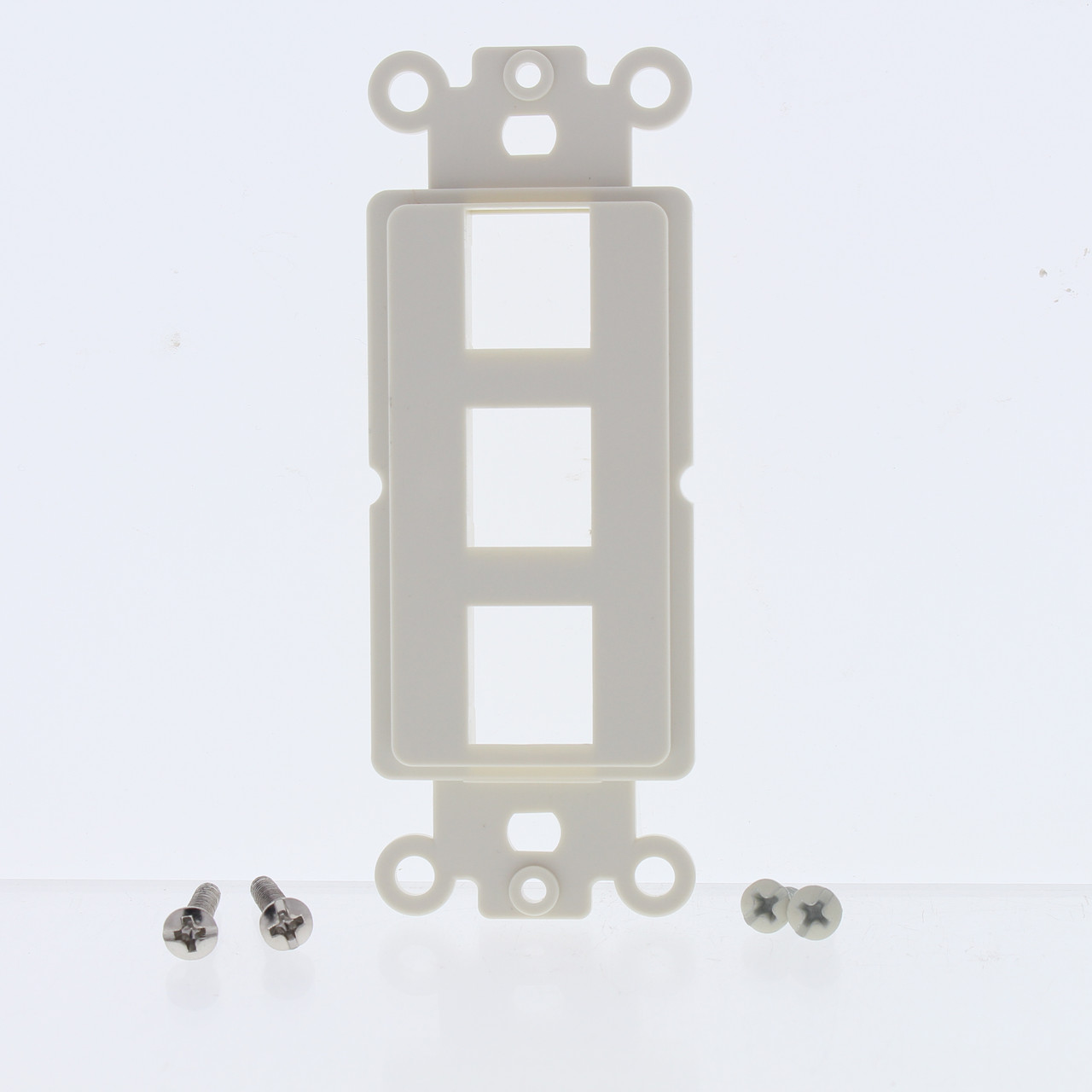 Cooper 5522-5ELA light almond 3-port decorator mounting strap platform insert along with a matching wallplate. Decorator styling to match surrounding fixtures. Can be used with standard jacks, F-connector, audio style, and blank face inserts for your audio, video, telecom, and networking needs.
