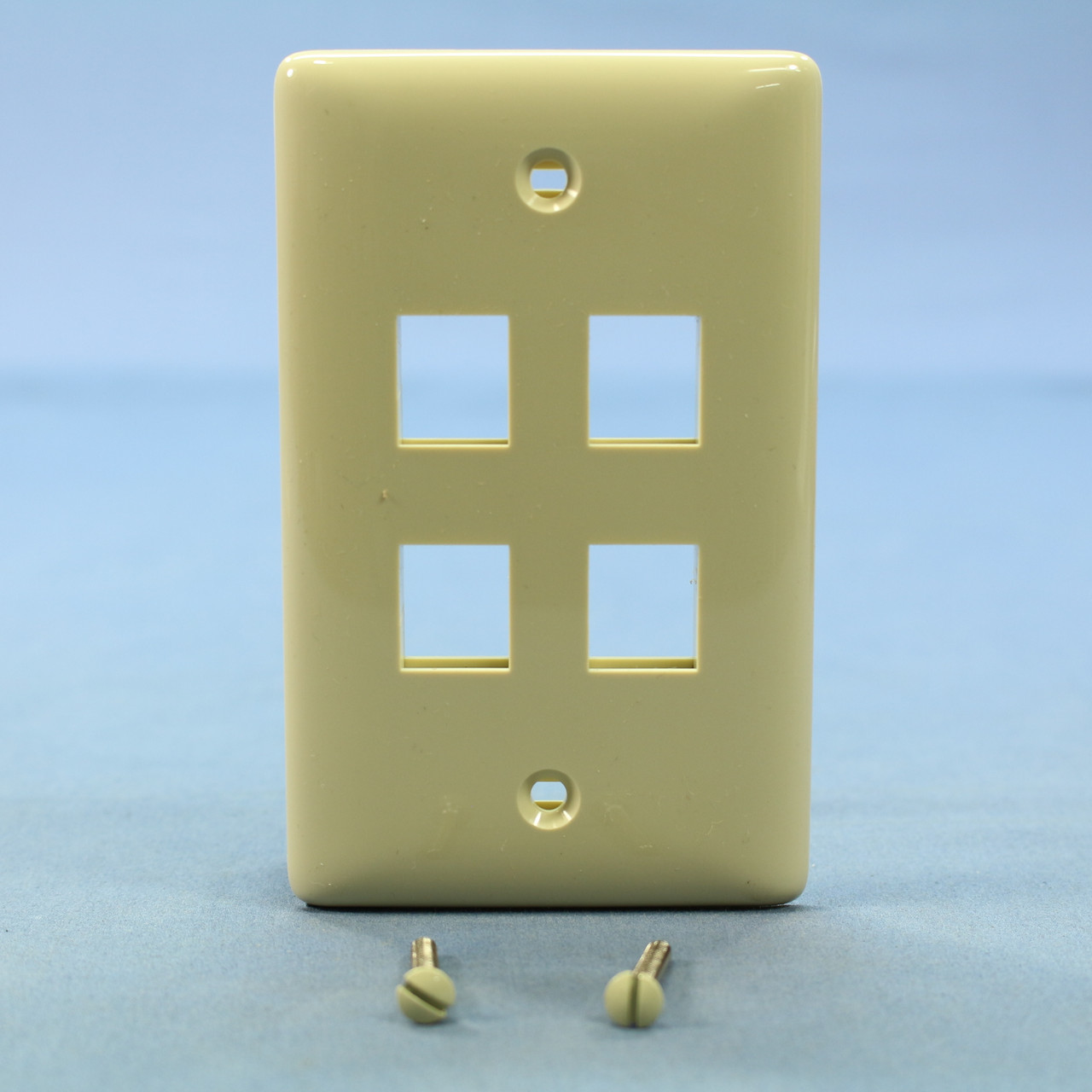 Hubbell NSP14I ivory 4-port multimedia wallplate. Flush mounted design that accepts all Hubbell keystone snap-in modules for your audio, video, and telecommunications needs. Can be mounted to recessed wall boxes and brackets for a low profile look; also attaches to surface mount wiring boxes. Includes color matching mounting screws. Packaging may vary.