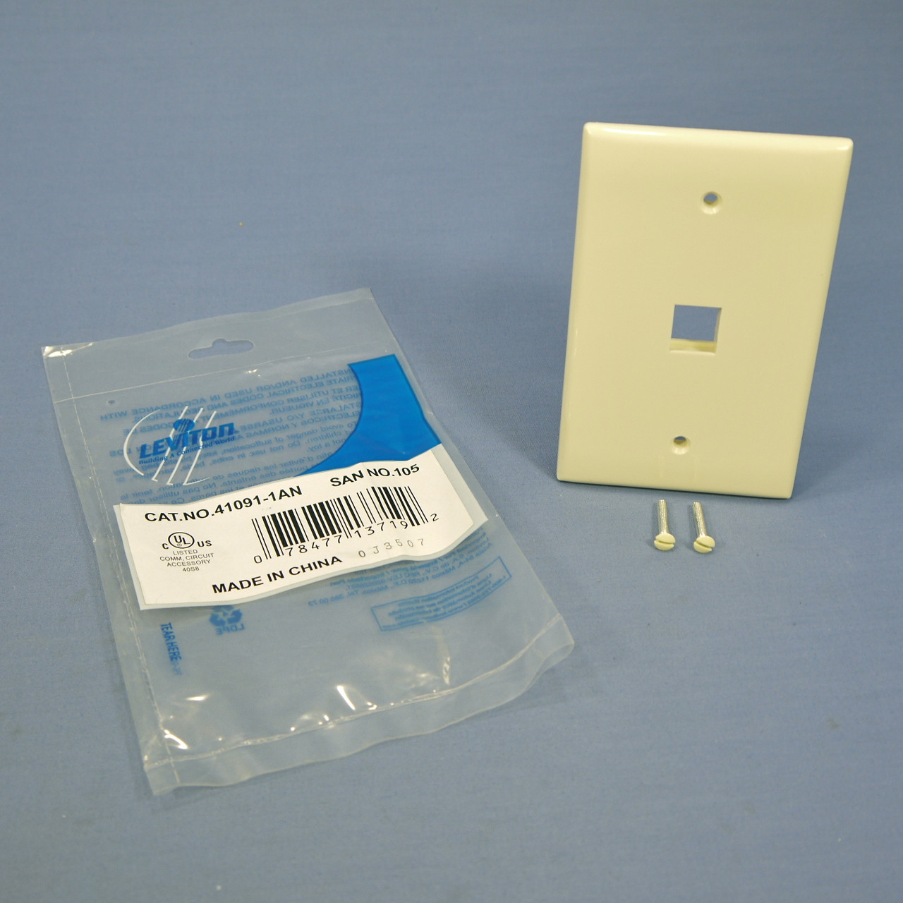 Leviton 41091-1AN almond 1-port Quickport wallplate. Midway size plate measures 3-1/8"w x 4-7/8"h, 3/8" larger than a standard plate in both directions for use with larger volume outlet boxes or to hide wall irregularities. Flush mounted design that accepts Leviton QuickPort snap-in modules for your audio, video, and telecommunications needs. Beware the knockoffs that claim Quickport compatibility; the fit is often loose and does not leave the jack flush with the face of the wallplate - only Leviton Quickport provides guaranteed secure insertion and flush mounting. Can be mounted to recessed wall boxes and brackets for a low profile look; also attaches to surface mount wiring boxes. Includes color matching mounting screws. Packaging may vary.