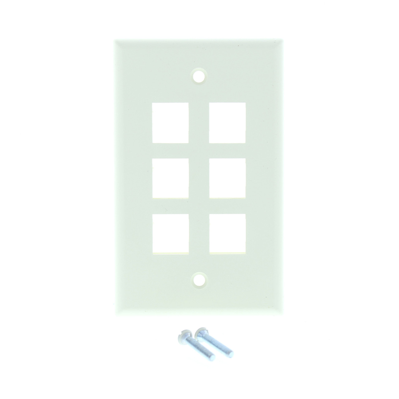 Leviton 41080-6AP almond 6-port Quickport wallplate. Flush mounted design that accepts Leviton QuickPort snap-in modules for your audio, video, and telecommunications needs. Beware the knockoffs that claim Quickport compatibility; the fit is often loose and does not leave the jack flush with the face of the wallplate - only Leviton Quickport provides guaranteed secure insertion and flush mounting. Can be mounted to recessed wall boxes and brackets for a low profile look; also attaches to surface mount wiring boxes. Includes color matching mounting screws. Packaging may vary.