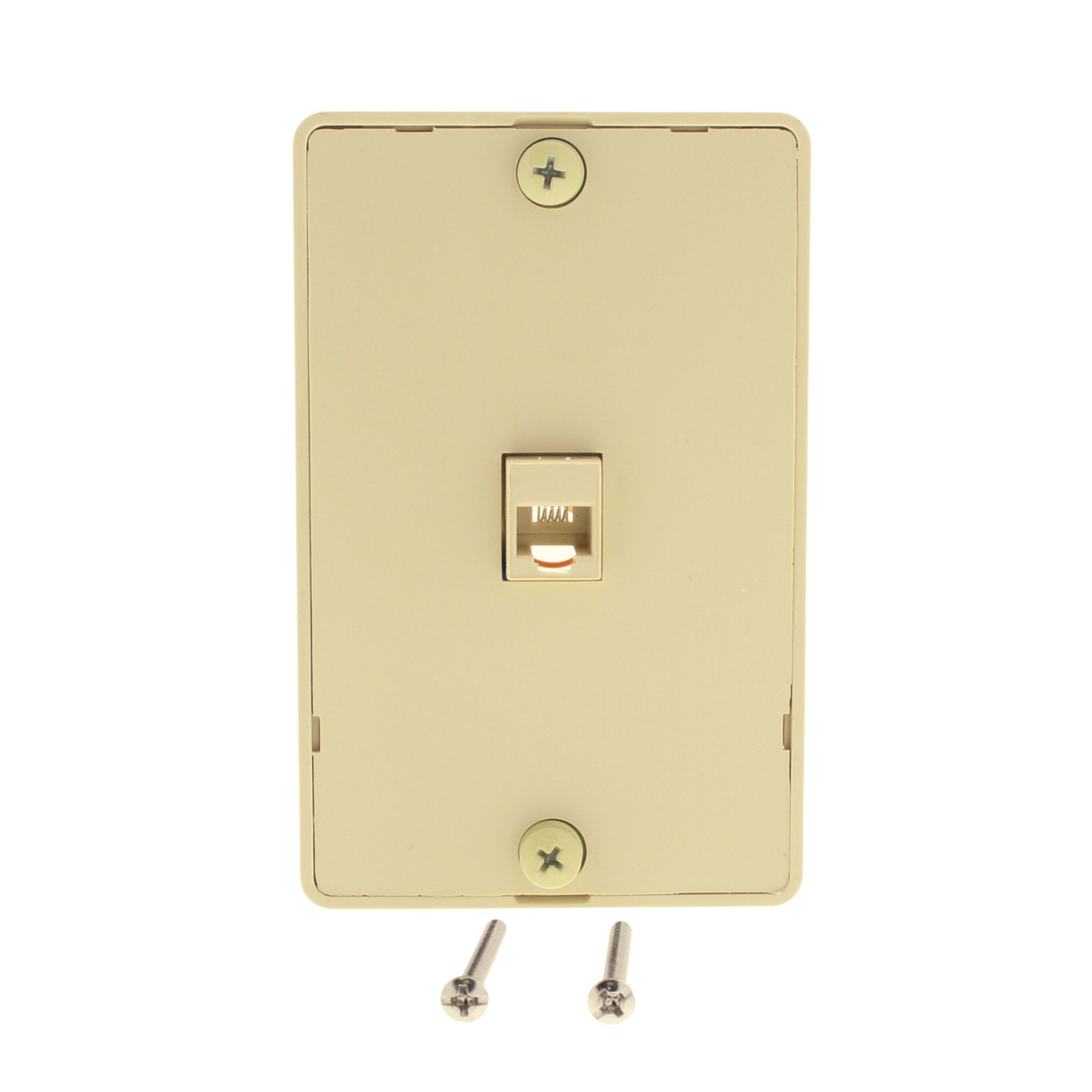 Cooper 3521-4V ivory wallmount telephone jack with screw terminals. Used to mount a standard wall phone directly to the wall with no exposed wires for a clean sleek look (wires are routed through wall). Features include: