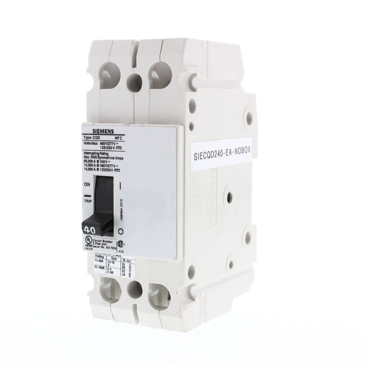 - Siemens 40A 2-Pole 480/277V AC 14KAIC Cable In/Cable Out Breaker Bulk CQD240