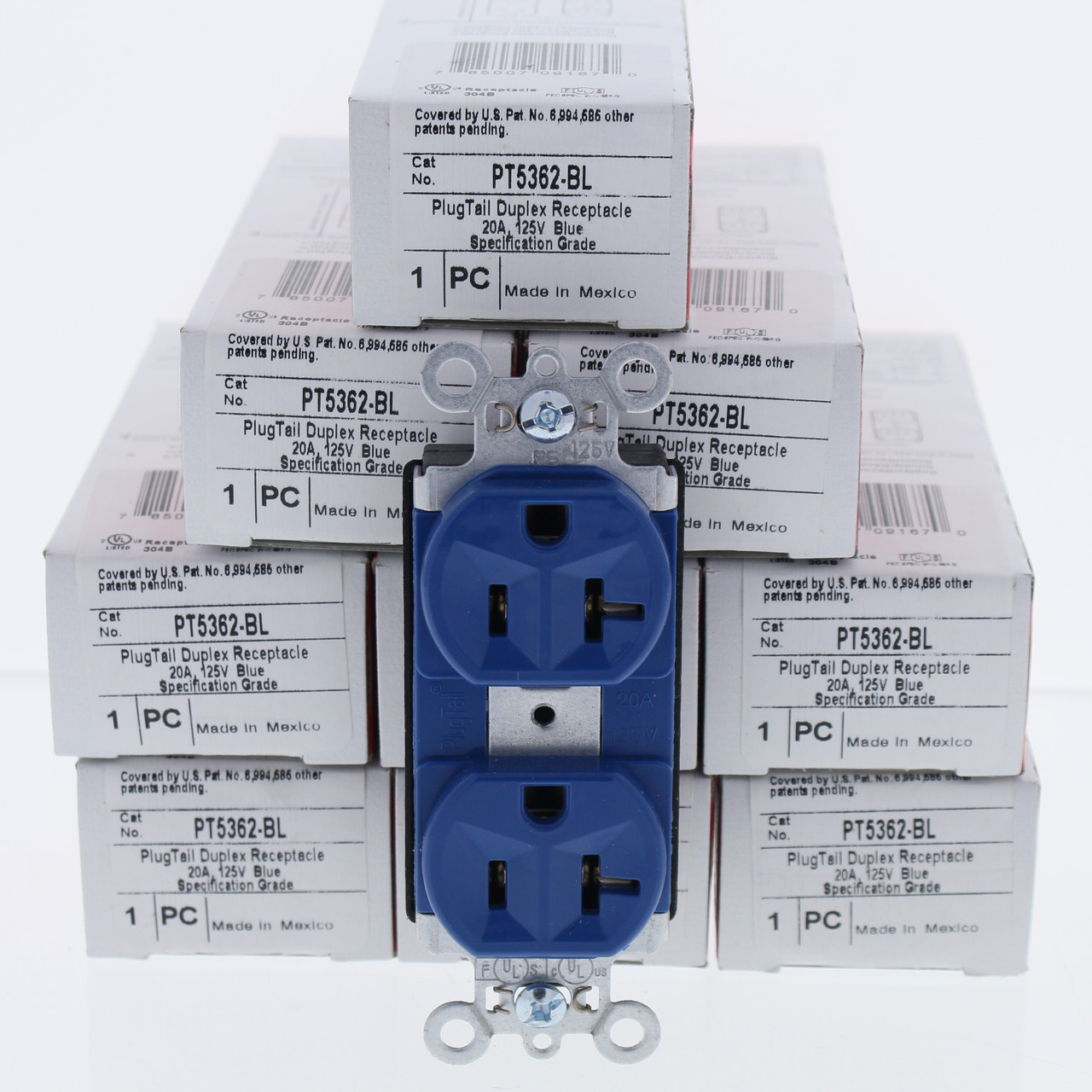 10 Pass & Seymour PT5362-BL blue duplex receptacles for use with PlugTail receptacle connectors. The bright blue color is great for locations where you want to call attention to your receptacles: workshops, computer rooms, offices, etc. Please note that PlugTail Wiring Connectors are NOT included. You must purchase the particular style that you want in order to install this outlet. PlugTail connectors (sold separately) are wired in at rough-in so all of your connections are completed up front. With no exposed terminals, you can power-up and test a circuit at any time once the connectors are installed. When it comes time to install your switch or receptacle, your connections have already been completed, so there is no stripping or taping - you remove the protective plastic wrapper and plug the connector into your device. Ensures a safe, reliable connection while at the same time providing for extremely fast and easy installation. Specification Grade, NEMA 5-20R, 2-pole, 3-wire, grounding, rated 20A 125V. Features include: