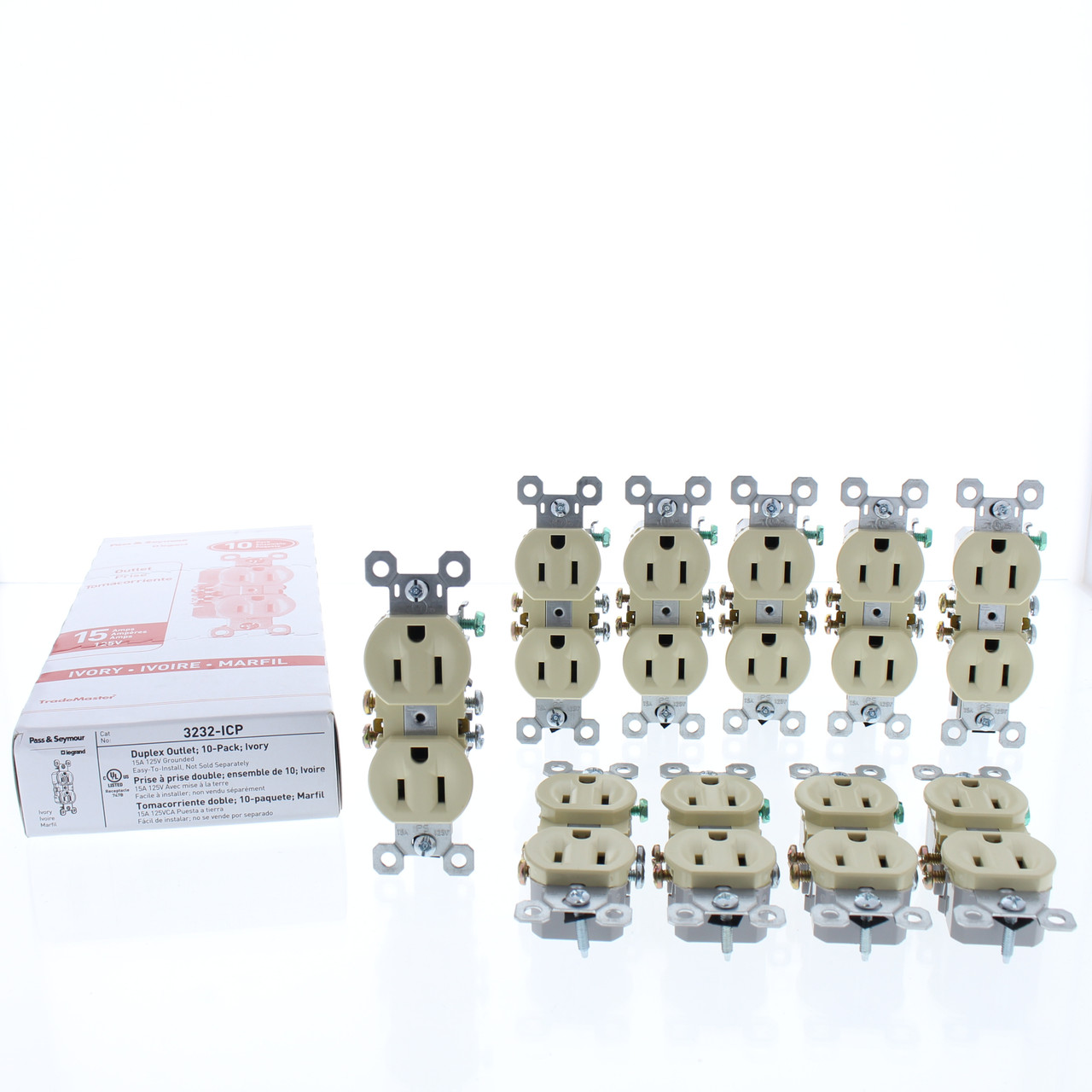 10 Pass & Seymour Legrand 3232-ICP ivory Trademaster duplex receptacles. Residential grade, NEMA 5-15R, 2-pole, 3-wire, push-in and back wired, grounding, rated 15A 125V. Features include: