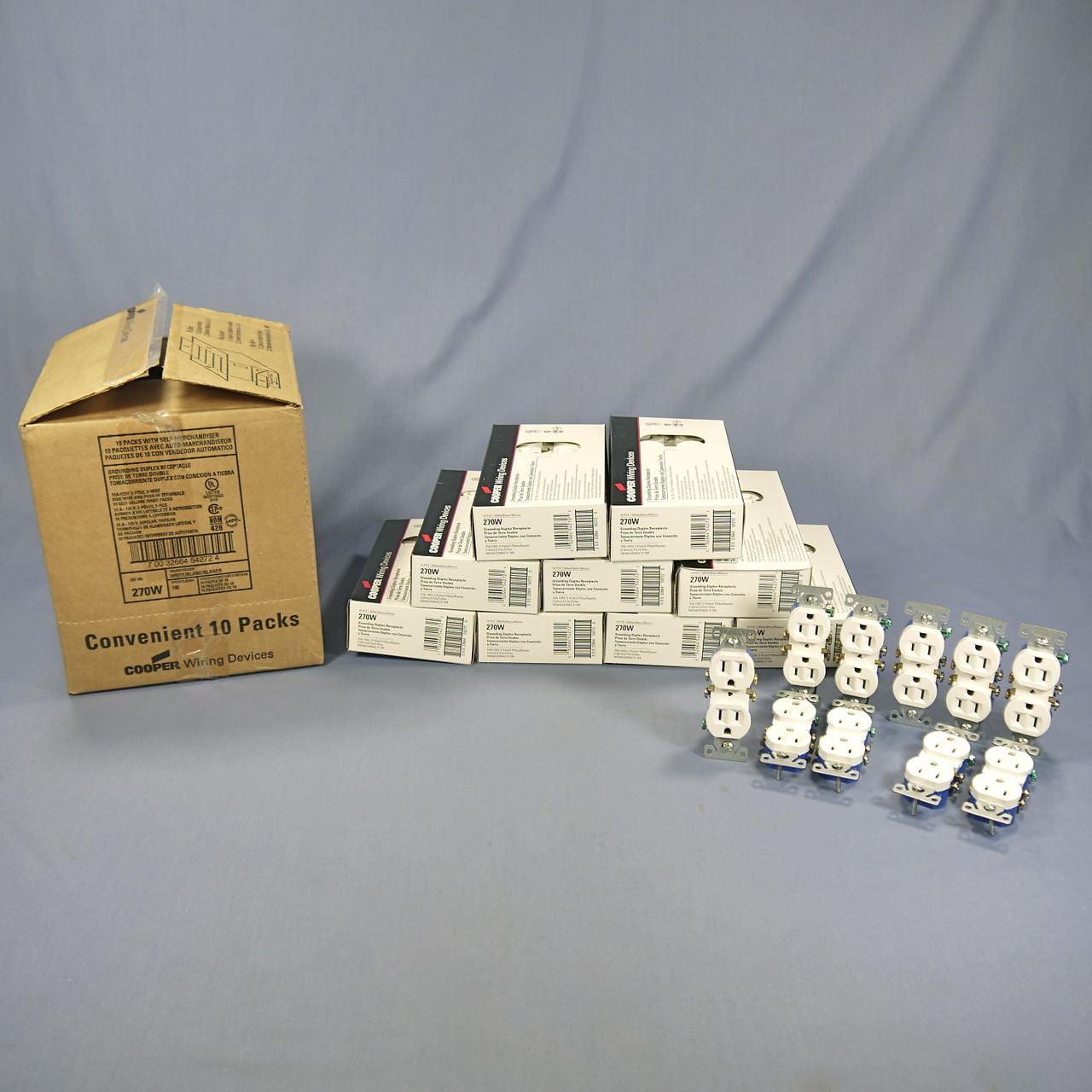 100 Cooper Wiring Devices 270W white duplex receptacles. Residential Grade, NEMA 5-15R, 2-pole, 3-wire, grounding, rated 15A 125V. Bulk packed loose in carton with no individual packaging or instructions. Features include: