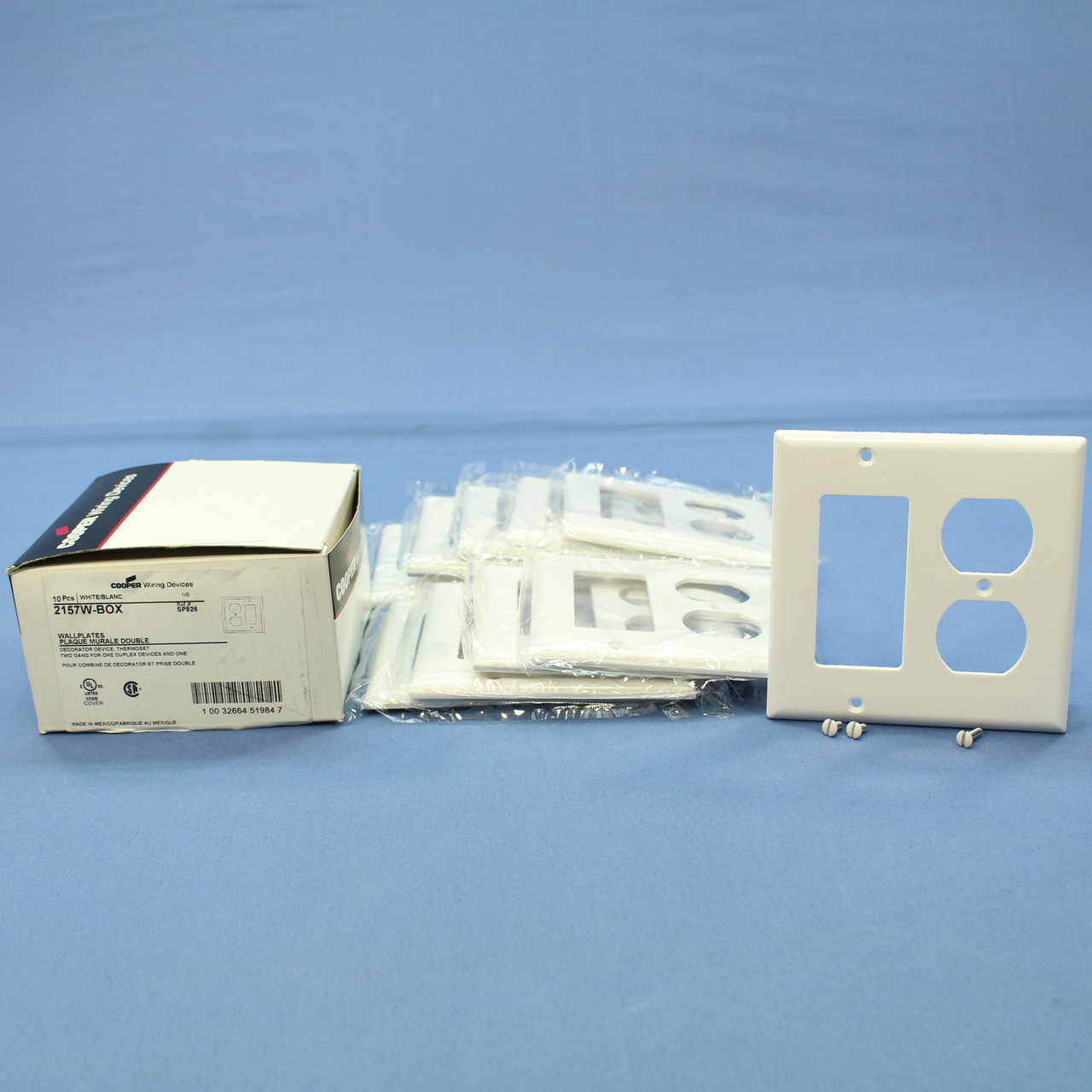 10 Cooper 2157W white 2-gang combination duplex receptacle & Decorator thermoset wallplates. Decorator opening fits any standard GFCI or Decorator device. It is Standard Grade, standard size wallplate, measuring 4.5"h x 4.563"w. Features include: