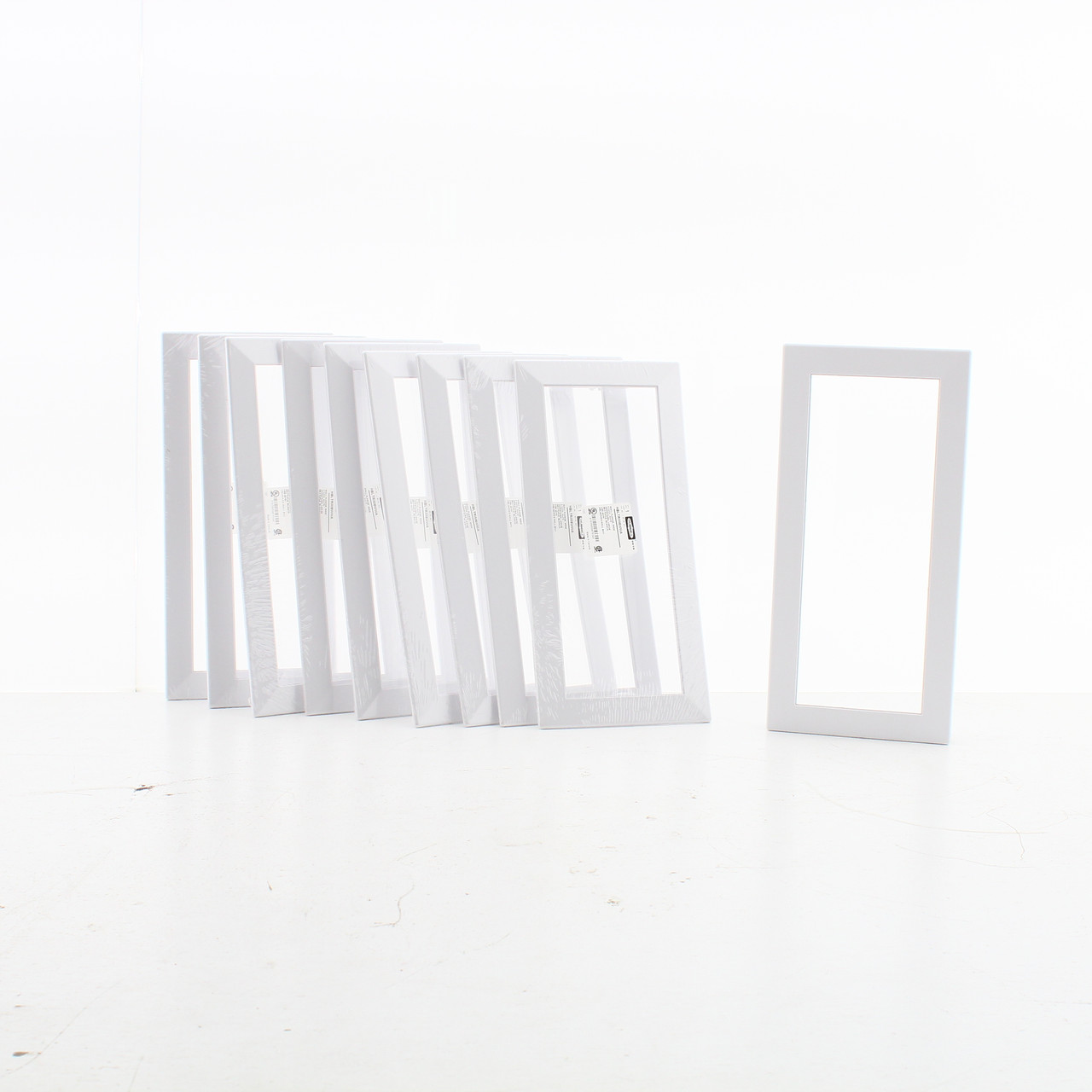 10 Hubbell HBLTRIM6WWA white 6-gang wall flange wall box covers. Residential Grade, measures 6.75"h x 13.25"w (opening measures 4.50"h x 12.10" w) with a rectangular opening that is compatible with Hubbell HBL Series recessed wall boxes and flanges. Features include:
