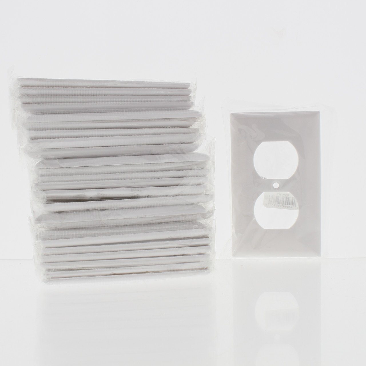Cooper 2132 duplex outlet cover plate. Residential Grade receptacle wallplate, standard size, measuring 4.5"h x 2.75"w. Each is individually packaged; packaging may differ from photo. Features include: