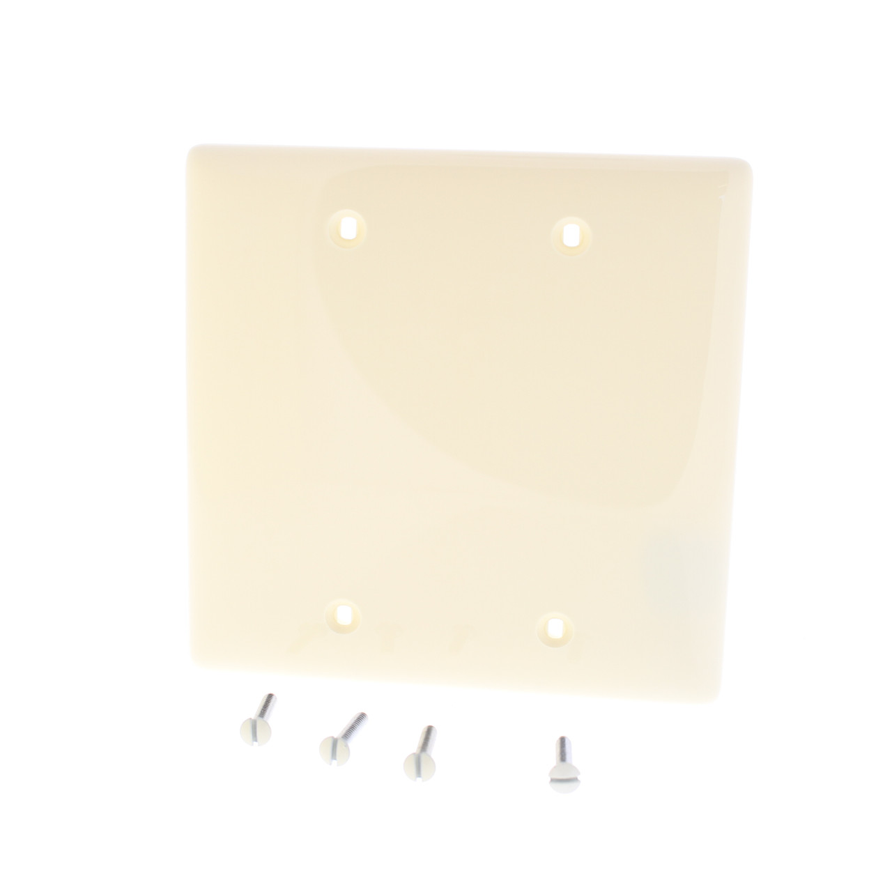 Hubbell NP23AL almond 2-gang blank wallplate. Commercial grade cover with slightly oversize dimensions, measuring 4.63"h x 4.68"w, that are an extra 1/8" in length and width than standard plates from other manufacturers to provide increased coverage around irregular wall openings. Made of a tough virtually unbreakable nylon - do not confuse it with regular plastic residential plates which can chip or crack. Features include: