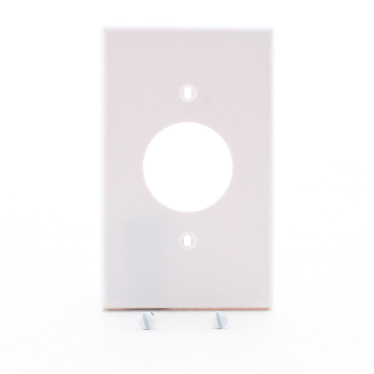 Hubbell P7W white 1-gang wallplate with a 1.406" diameter opening. Typically used for range, welder, and dryer outlets. Commercial grade cover with slightly oversize dimensions, measuring 4.63"h x 2.87"w, that are an extra 1/8" in length and width than standard plates from other manufacturers for increased coverage around irregular wall openings. Made of a tough virtually unbreakable nylon - do not confuse it with regular plastic residential plates which can chip or crack. Features include: