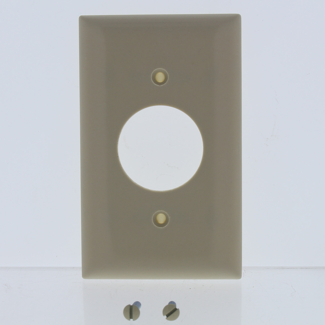 Pass and Seymour SP7-I ivory single receptacle wallplate. Residential grade, standard single gang size, measuring 4.5"h x 2.75"w with one 1.406" diameter opening. Each is individually packaged; packaging may differ from photos. Features include:
