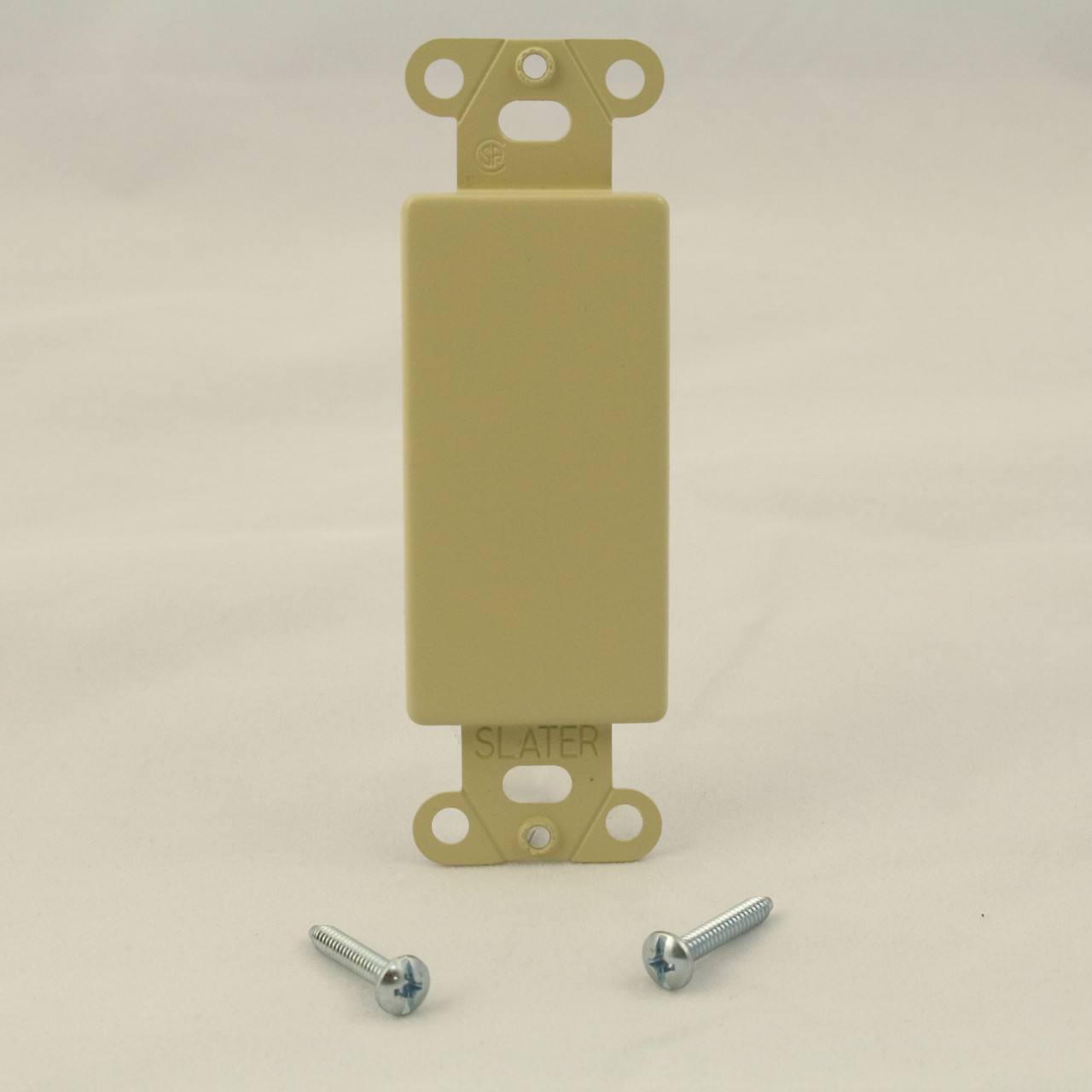 Pass and Seymour 326-I ivory Decorator blank metal filler plate (marked "Slater"; Slater is a division of Pass & Seymour Legrand). Residential Grade metal blank fits Decorator and GFCI wallplates. Use it to fill vacant spots for further expansion or to occupy the space of a removed fixture. Each is individually packaged; packaging may differ from photos.