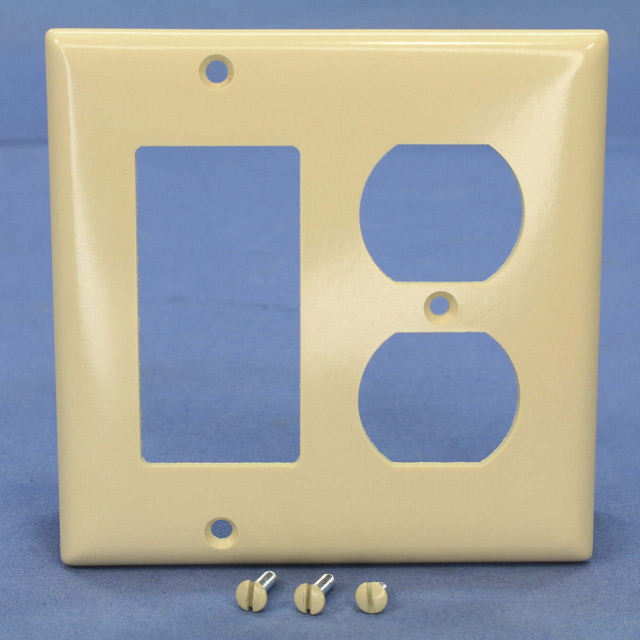 Pass and Seymour SP826-I ivory 2-gang combination duplex outlet and decorator/GFCI cover. Each wallplate has duplex outlet opening and one rectangular opening which is compatible with standard GFCI and decorator type devices. Commercial Specification Grade, standard size measuring 4.5"H x 4.56"W. Features include: