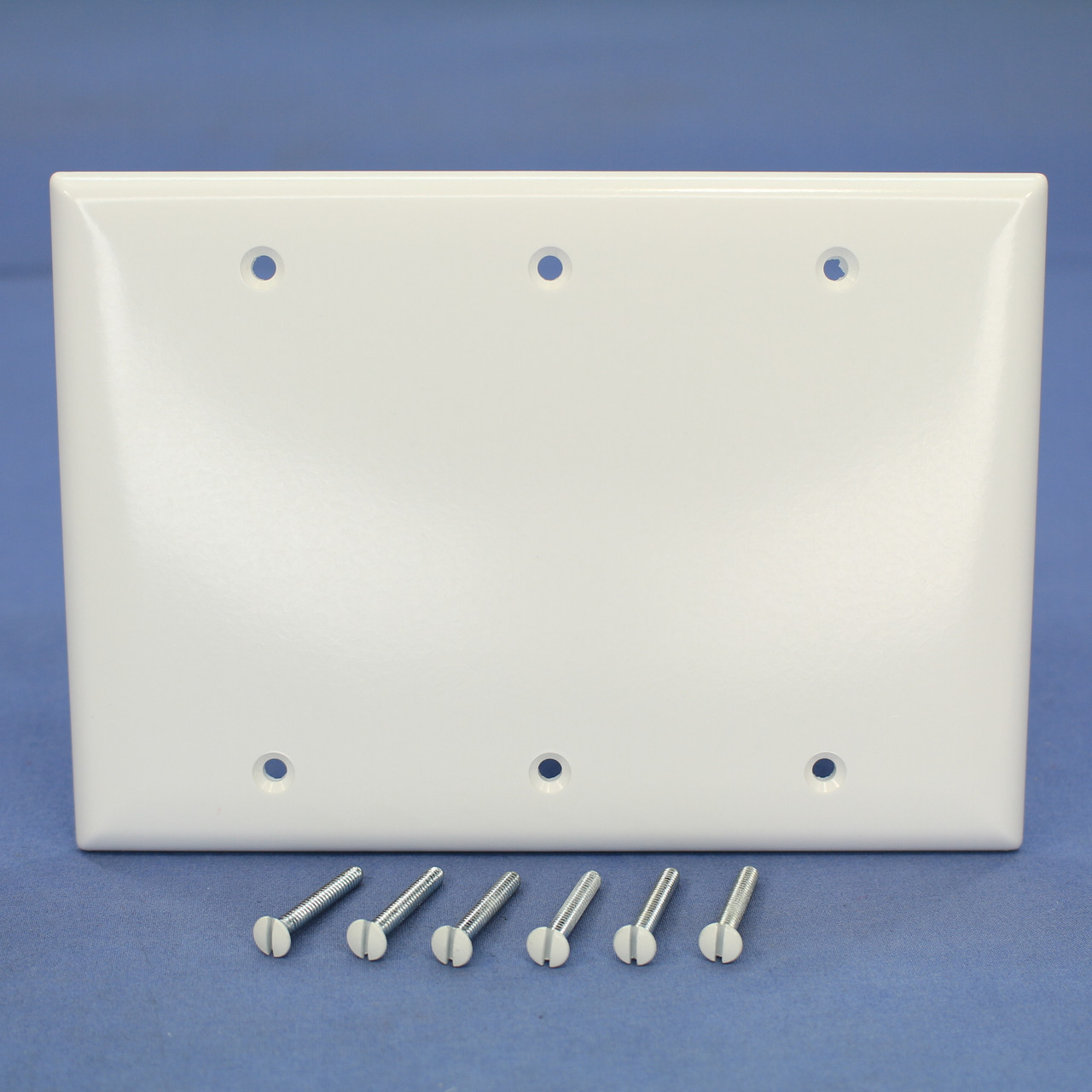 Pass and Seymour SP33-W white blank box-mount 3-gang wallplate. Residential Grade, standard 3-gang size plate measuring 6.375"h x 4.5"w. Each is individually packaged; packaging may differ from photos. Features include: