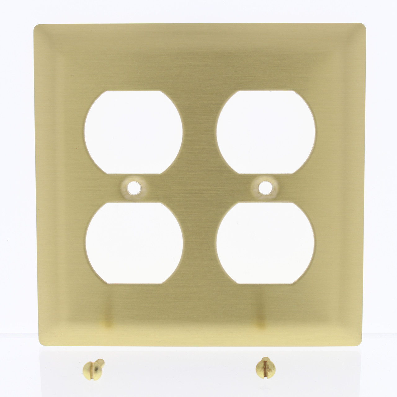 Pass and Seymour SB82 brushed solid brass 2-gang duplex outlet receptacle wallplate. These brass plates come with a plastic protective film over them. Commercial specification grade, standard size, measuring 4.56"W x 4.5"H. Made of .042" thick brass alloy with a polished finish; brushed finish has a horizontal orientation. Features include: