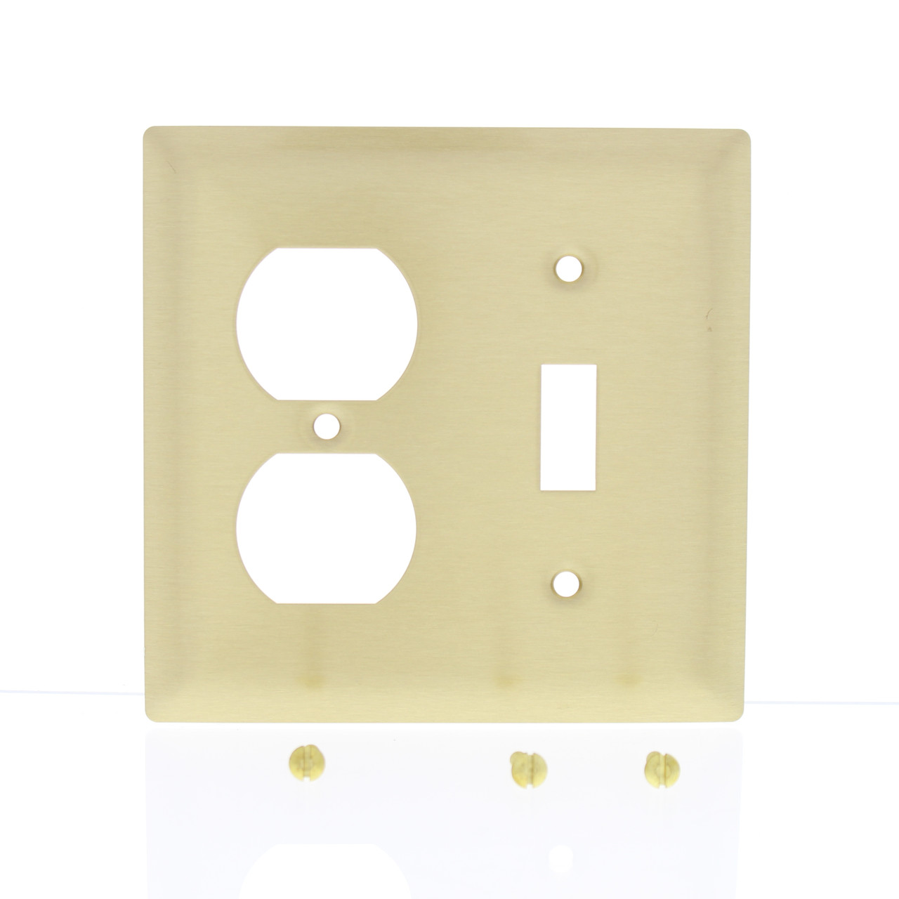 Pass & Seymour SB18-CC brushed solid brass 2-gang combination switch/receptacle wallplate. Standard 2-gang size, measuring 4.56"W x 4.5"H, with openings for a toggle switch and duplex receptacle. 70% copper, 30% zinc alloy gives warm, appealing finish to modern decor as well as retrofit applications. Lacquered to prevent corrosion. Each is coated with a clear plastic film to keep the finish unmarred during construction - can be removed upon completion. Each is individually packaged; packaging may differ from photos. Features include: