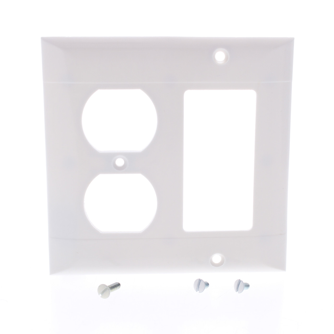 Pass and Seymour P826-W white 2-gang combination duplex outlet and Decorator/GFCI/rocker cover. P-Line Series - wallplate has 2 horizontal lines on the face of the plate. Residential Grade, standard size plate measuring 4.50"h x 4.56"w. Each is individually packaged; packaging may differ from photos. Features include:
