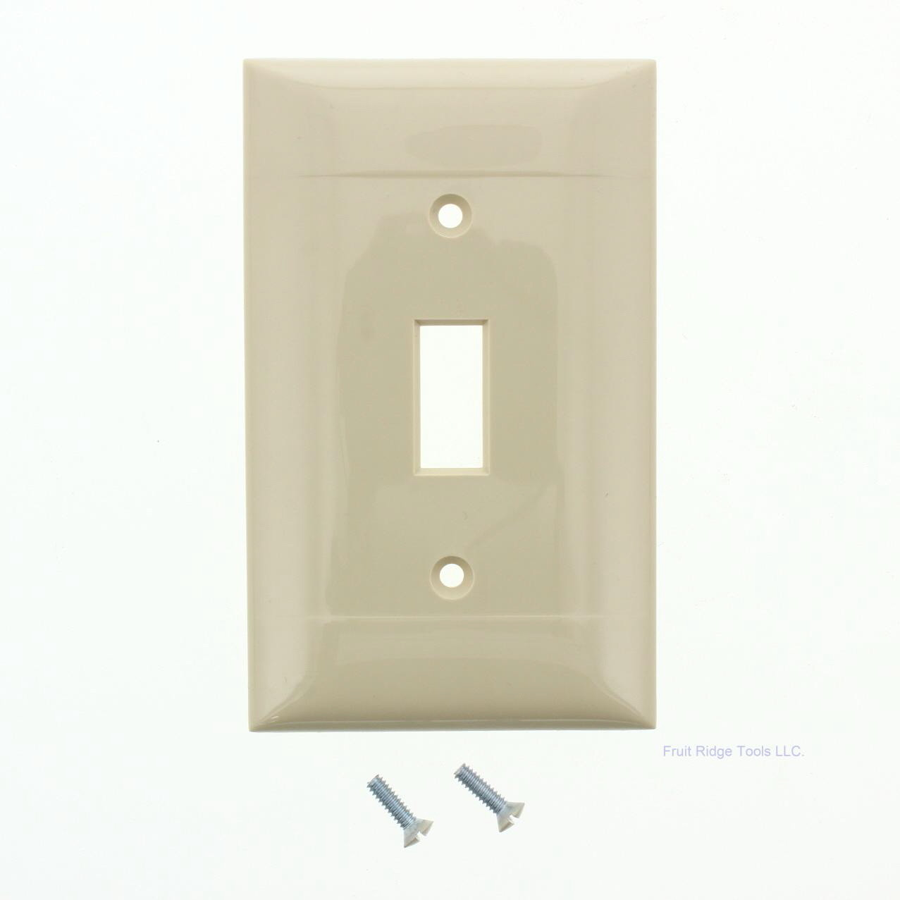 Pass and Seymour #SRP1-I ivory toggle switch wallplate. The wallplate is made of durable thermoplastic material and measures 2.75"W x 4.5"L. The single gang wallplate is standard size and UL listed. Each is individually packaged; packaging may differ from photo.