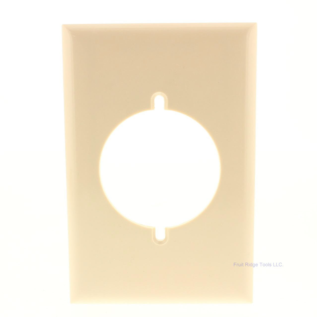 Pass and Seymour 384-I ivory power outlet cover. Residential grade with 2.15" diameter receptacle opening. Standard size, measuring 4.5"h x 2.75"w. Typically used for straight blade power outlets for dryers, ranges, and welders. Each is individually packaged; packaging may differ from photos. Features include: