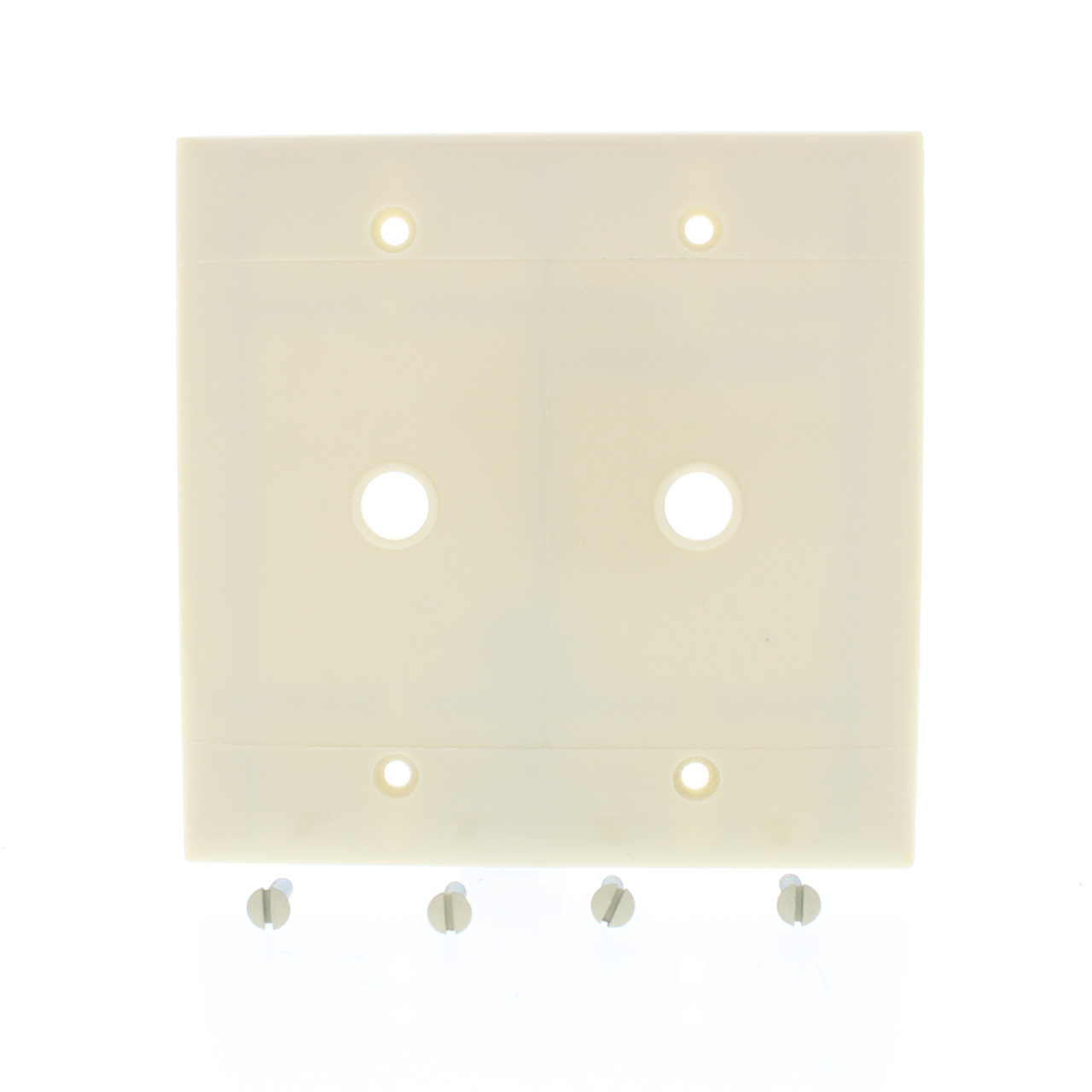 Pass & Seymour SSP21-I 2-gang ivory wallplate for telephone or cable connections. Residential Grade, box mount, standard size 2-gang plate, measuring 4.5"h x 4.56"w with a .406" diameter hole for telephone or cable applications. Each is individually packaged; packaging may differ from photos. Features include: