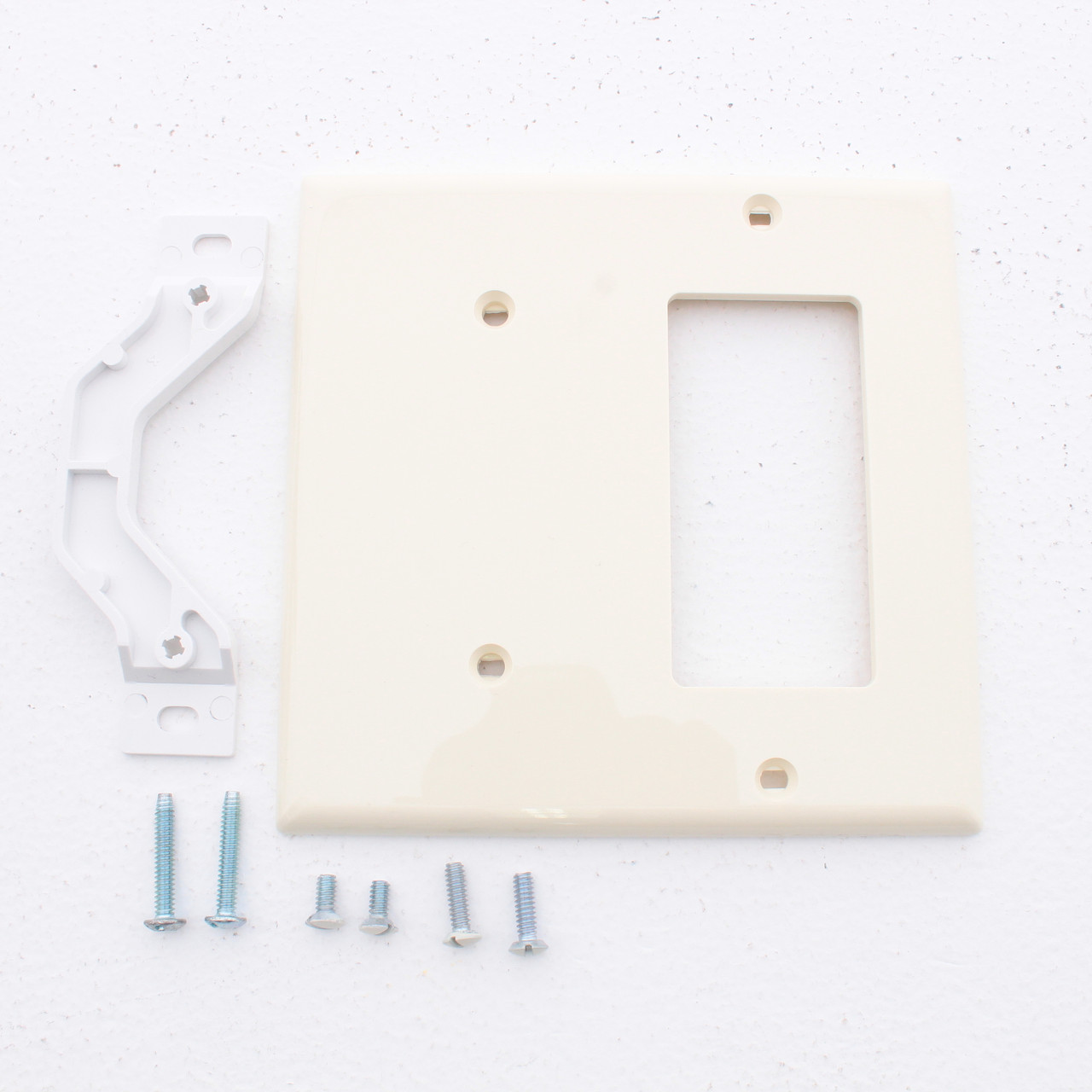 Leviton 80708-A Almond 2-gang combination Decora/blank wallplate. Commercial grade, standard size plate (4.5"h x 4.56"w) with one Decora/GFCI opening and one strap mount blank space. Made of a high performance unbreakable thermoplastic material - do not confuse this with regular Residential Grade wallplates which can chip or crack. Features include: