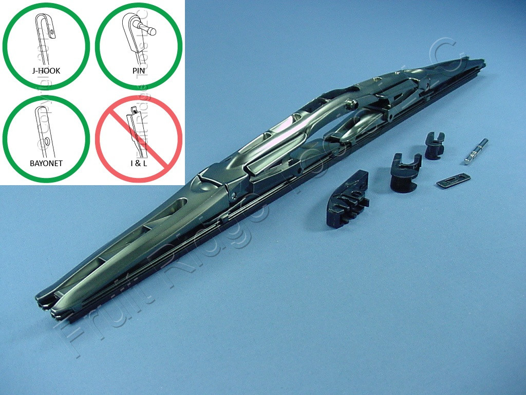 This is for 1 WBP-18GM Universal Dual Wiper Blade by Pilot Automotive with a Gun Metal Looking finish. This wiper will fit 18" and 19" length wipers for the following arm styles: J-hook, Side Pin, Bayonet, and Seperate Pin. The Specialty adaptors are included as well as installation instructions. Pilot made these wires using advanced computer-aided product design for maximum performance and efficiency. These wipers even work with vehicles that have retractable wipers as well. If you have any questions please email us. Thank you.